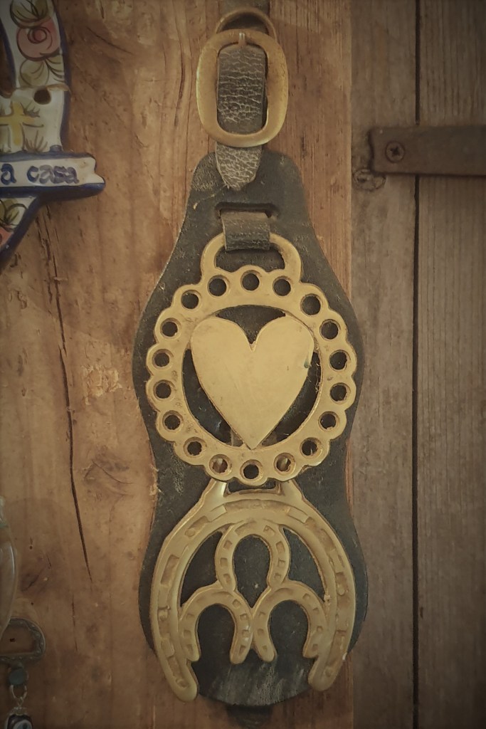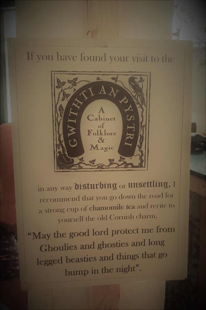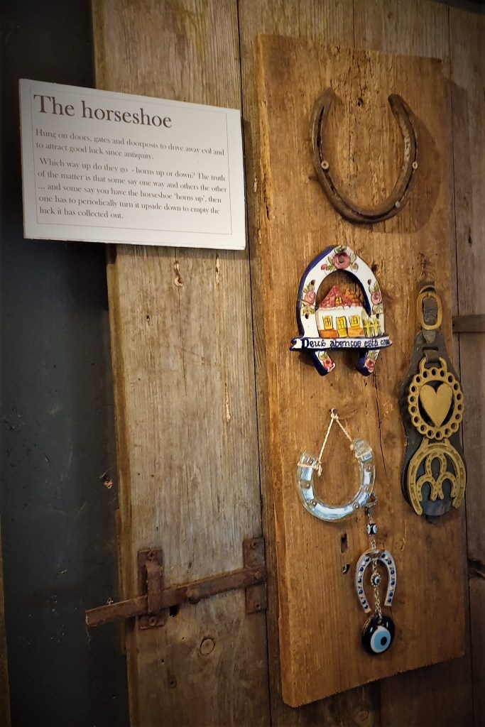 Seems like there is no agreement as to the origin of the horseshoe’s luck, and as if that wasn’t enough—the correct direction that a horseshoe should be facing is generally considered a hot topic for folklore academics as well! In countries such as England, it is said that the horse shoe should have its tips pointing upwards, so that luck may fall inside it much like a cup. However, in my native Portugal (and as you can see from the image below depicting a china clay horse shoe displayed at the Gwithti An Pystri), the horseshoe is typically placed downwards, so as to act as a doorway into which luck flows easily. Curiously, it was only when I visited the Museum of Magic & Folklore that curator Steve Patterson discovered this china clay horse shoe was Portuguese. I happily translated it for him, and made sure to perpetuate its blessings in the Museum’s visitor log book!