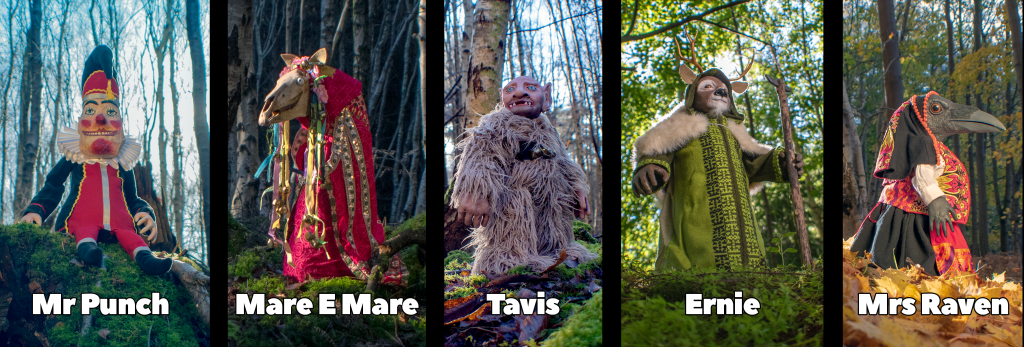 Image Description: a collection of photography works depicting archetypes transmitted to Claire and Will during their creative practice, including a Mr Punch doll and a decorated horse inspired by the Mari Lwyd. Image Credit: with permission from the copyright owners, Wyldheart and Wright.