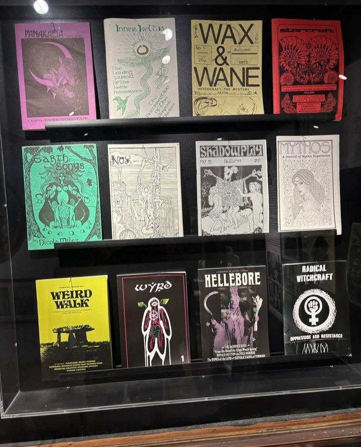 Image description: a photo of a display case at the Museum of Witchcraft and Magic in Boscastle, Cornwall, containing several artistic zines such as Weird Walk, Wyrd Zine and Hellebore. Image Credit: with permission from the copyright owners, Wyldheart and Wright.